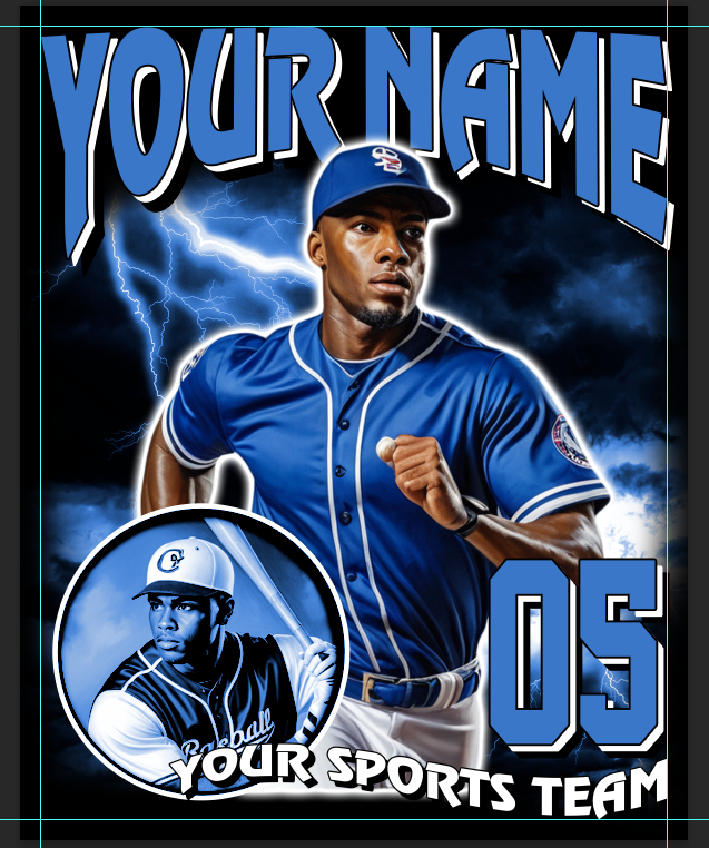 Step up to the plate with this custom sports bootleg-style t-shirt design. Featuring bold lightning effects, powerful portrait layouts, and retro-inspired graphics, this design is the perfect way to showcase your player pride. Personalize it with your name, jersey number, sports team, and photos to create a one-of-a-kind look that stands out on and off the field.